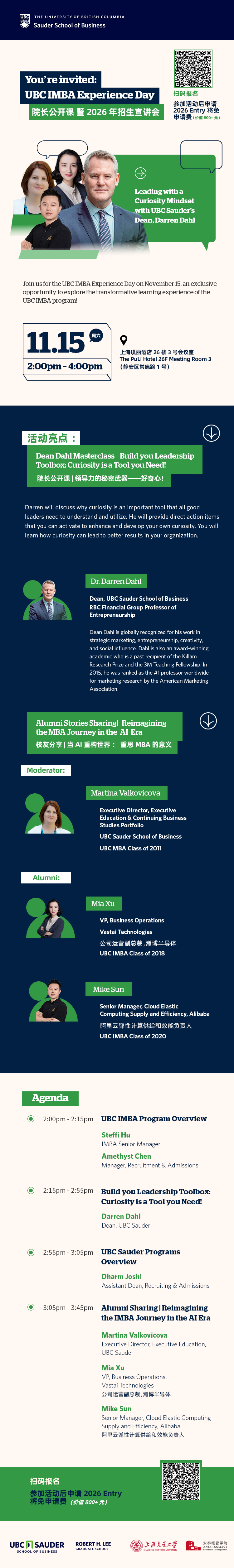 11月15号(周六),UBC IMBA将于上海静安璞丽酒店举办院长大师课暨2026年招生宣讲会。